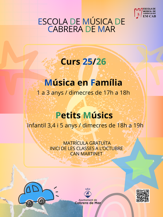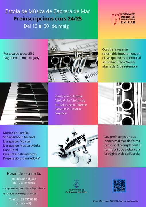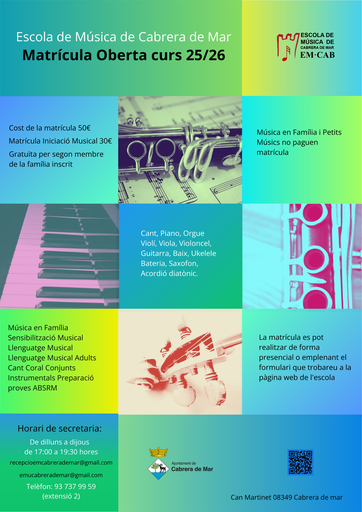 Per més informació poseu-vos en contacte amb secretaria de l'escola l'escola enviant correu a recepcioemcabrerademar@gmail.com o trucant al telèfon 93 759 30 51 de dilluns a dijous 17h a 19:30h